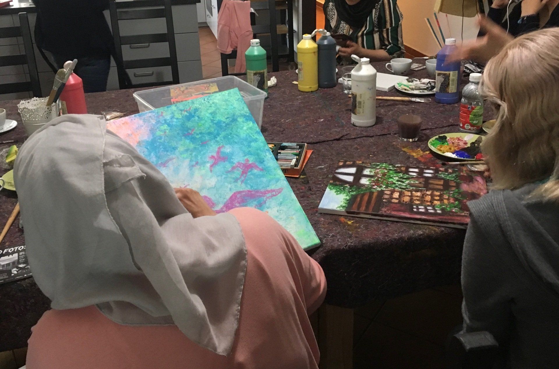 Sie malen Bilder, die Erlebtes ausdrücken. Und dort, wo Sprache fehlt, erzählen diese Bilder ihre Geschichten, sie drücken ihre Gefühle aus. „Kerstin, ich bin immer so müde und kann mich gar nicht konzentrieren. Ich fühle mich dumm, weil mir das Deutschlernen so schwerfällt.“ sagt eine andere Frau. Auch sie hat viel verloren und Schreckliches erlebt. Die Trauer drückt sich ganz unterschiedlich aus und es entlastet, zu wissen, dass Trauer auch müde und unkonzentriert machen kann. Trauer braucht einen Raum!